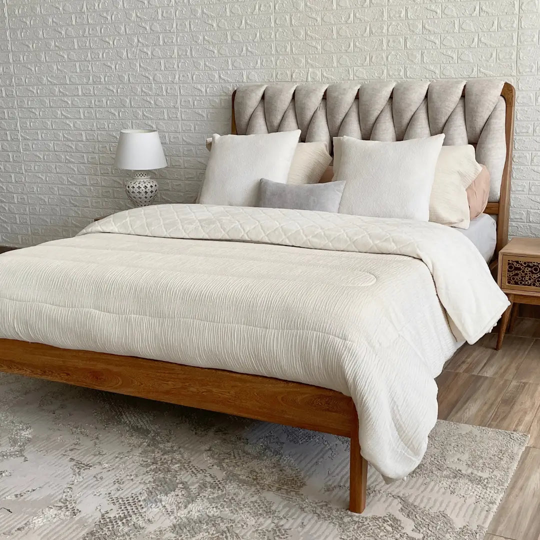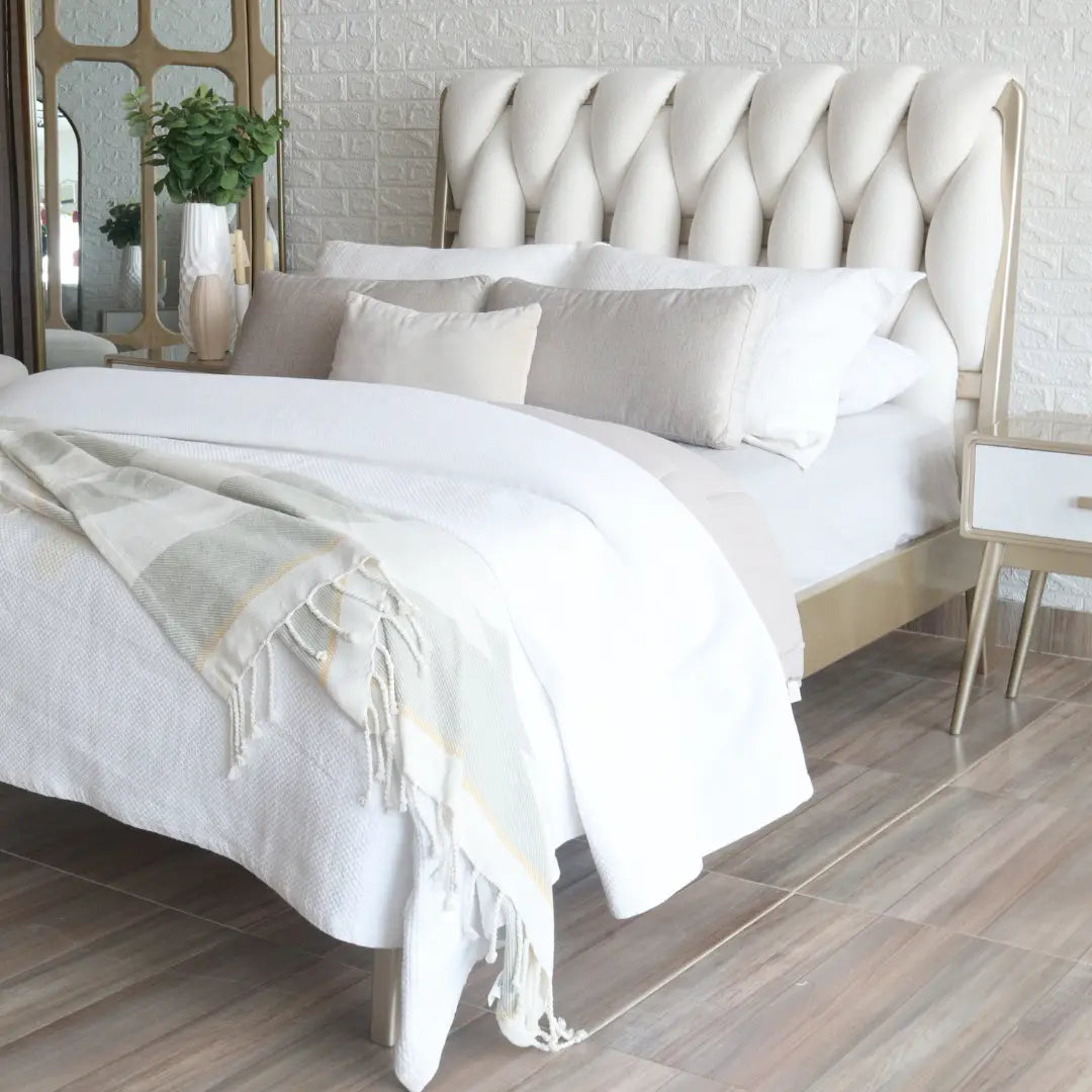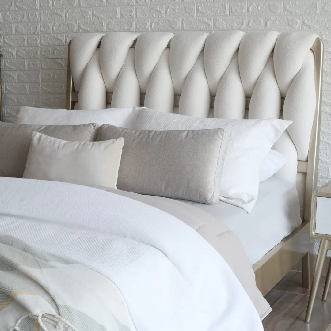 Los tejidos de nuestras piezas de diseño cuentan innumerables historias y sueños. Nuestra cama salamanca tiene un diseño tejido en la parte de su cabecero. Incluye también, largueros, pieceros y tendido de tablas. Puedes personalizar sus acabados y tapizados.