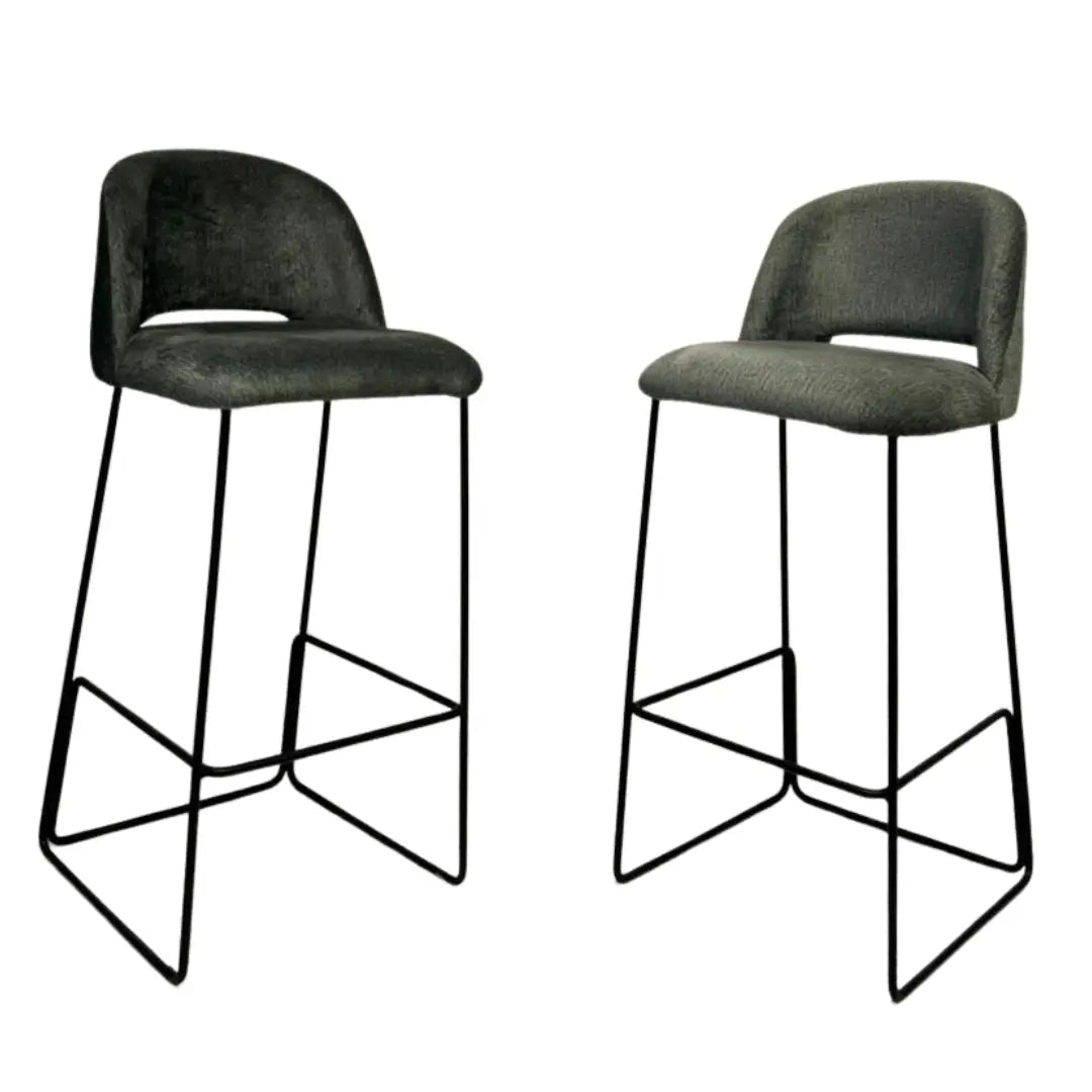 Silla de bar de diseño moderno con una silueta ligera y elegante. Presenta un asiento amplio con respaldo curvo que brinda comodidad y soporte, incorporando una abertura que aporta un detalle visual distintivo. Su estructura elevada con patas estilizadas y refuerzos inferiores crea una base estable y contemporánea, ideal para barras o espacios sociales con un estilo actual.